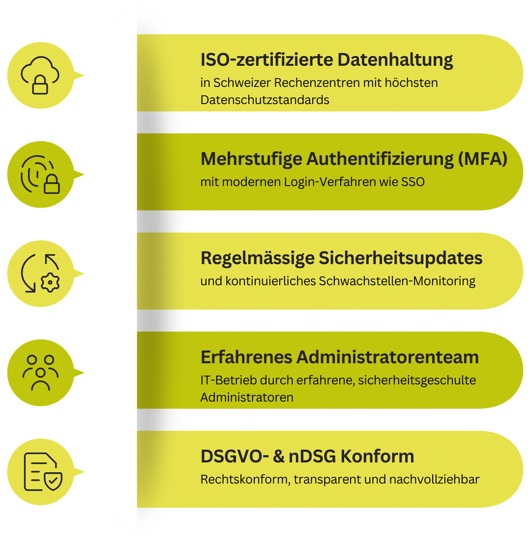 Wir legen grossen Wert auf Datenschutz und Sicherheit: Die Daten werden ISO-zertifiziert in der Schweiz gespeichert und durch moderne Authentifizierung geschützt. Unsere Infrastruktur wird laufend überwacht und entspricht vollständig der DSGVO sowie dem nDSG.