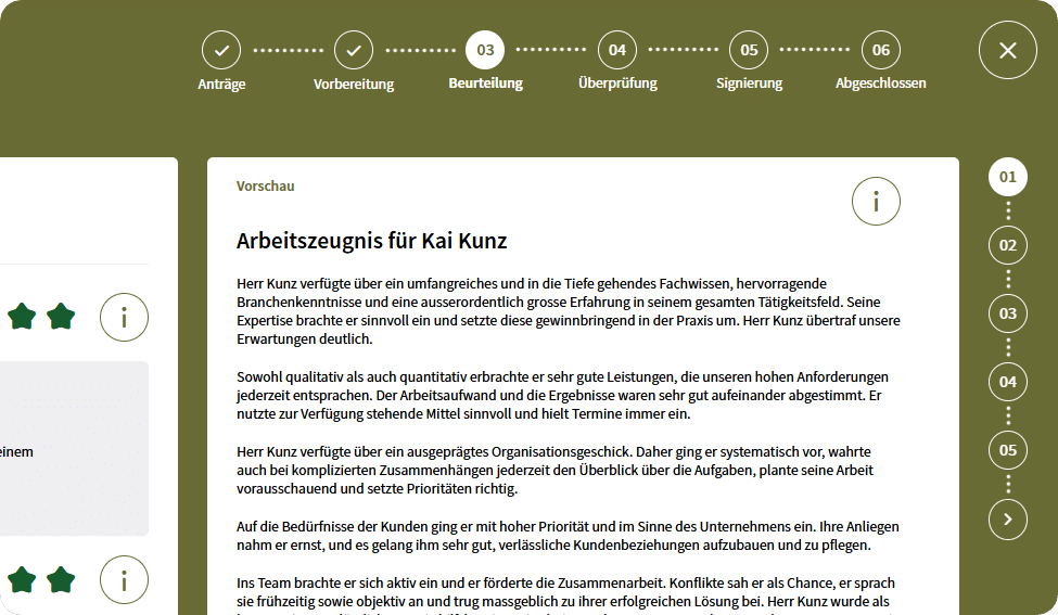 Qualität durch standardisierte ProzesseSie arbeiten mit einem standardisierten Workflow und profitieren von bewährten Kriterien und Textbausteinen für konstant hohe Qualität. -